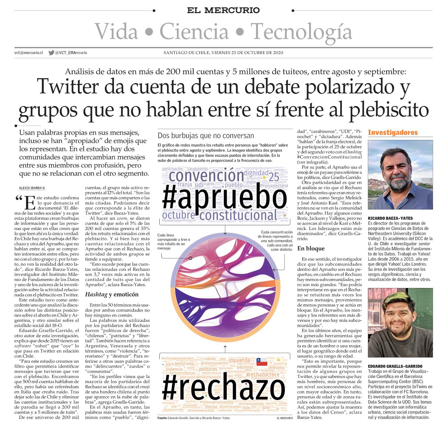 El uso más reciente de este proyecto es el análisis de la discusión sobre el plebiscito constitucional en Chile en Octubre de 2020, junto a Ricardo Baeza-Yates, donde estudiamos qué caracterizaba las posiciones de #apruebo/#rechazo una nueva constitución. Nuestro trabajo fue publicado en el periódico más importante de Chile, El Mercurio, en colaboración con el periodista Alexis Ibarra: