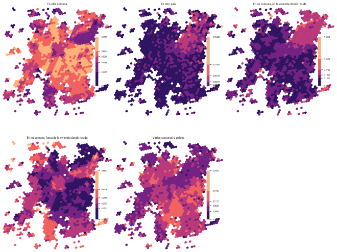 La distribución relativa del lugar de trabajo muestra patrones reconocibles: en el sector oriente, la población tiende a trabajar en la misma comuna, o incluso para otro país. Sin embargo, la variación intracomuna no es fuerte (y tenderíamos a pensar que sí), y eso se debe a que la asignación no considera esta variable ni se utilizó una variable que estuviese fuertemente correlacionada. Por tanto, la distribución se vuelve aleatoria dentro de la comuna.