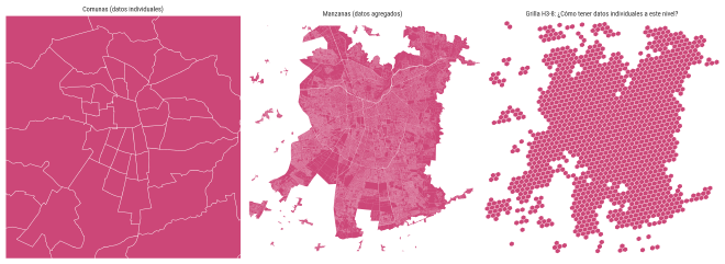 ¿Qué hacer, entonces? Podemos buscar una solución intermedia: un método de asignación que, dados los datos individuales a nivel comunal y los indicadores agregados a nivel de manzana, pueda distribuir las viviendas de las personas en distintas áreas geográficas, minimizando el error de asignación (medible porque se comparan los indicadores agregados con los indicadores que se pueden calcular después de asignar). En la siguiente imagen vemos comunas (datos individuales), manzanas (datos agregados), y una grilla regular hexagonal (sistema H3, resolución 8) a la que asignaremos viviendas del censo: