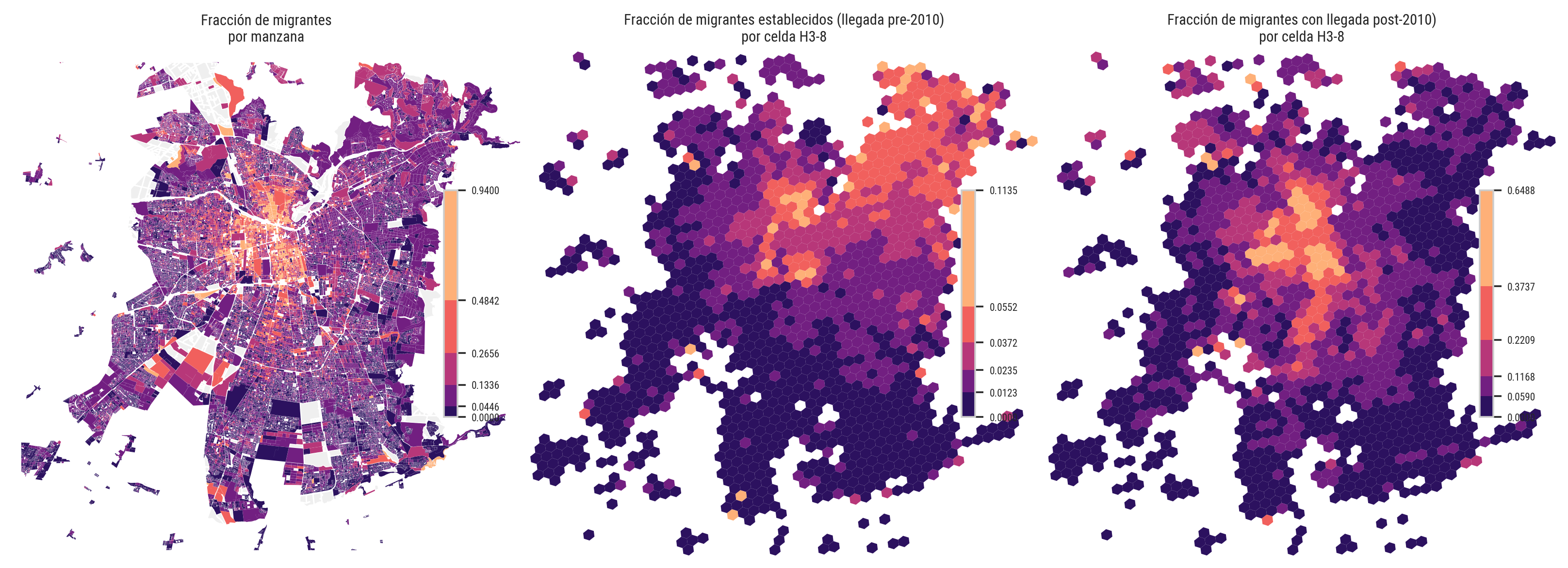 Al ver los mapas nos damos cuenta de que la población migrante tiene una distribución espacial diferente si consideramos su período de llegada.