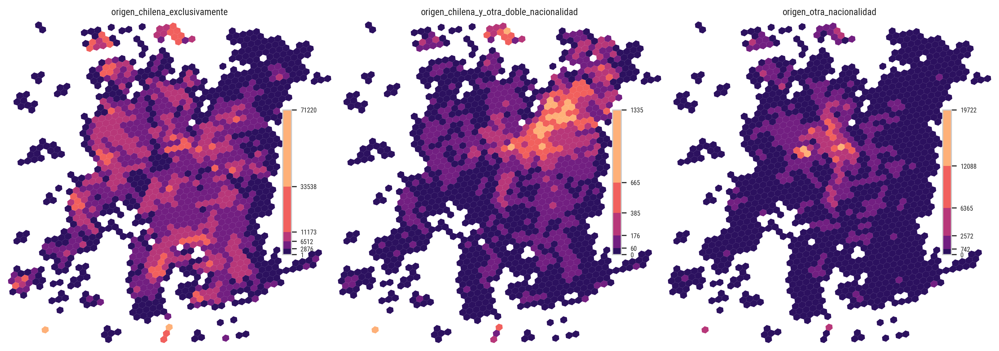 Noten que en efecto, el valor origen_otra_nacionalidad (mapa a la derecha) tiene una distribución similar a la distribución de migrantes por manzana.