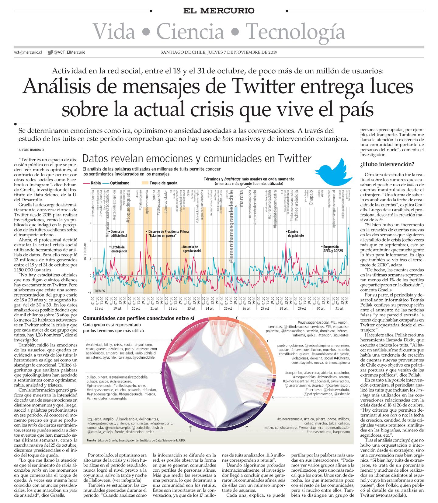 También utilicé el proyecto tsundoku para estudiar la reacción de la gente en Twitter al estallido social. Nuevamente junto a Alexis hicimos una nota que se publicó en El Mercurio: